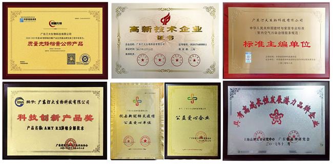 广东汀大生物科技有限公司独立自主发明AMT异味分解技术,在2006年立项研究,2019年正式发布上市。在研究尚未完成时,在2017年参加《中国节能环保创新应用大赛》,经国务院发展研究中心社会发展研究部主任周宏春和国务院环保部科技司副司长胥树凡共同考核后进入半决赛,其发明AMT异味分解技术获得国家和社会关注,经过十多年的科学研究发明,AMT异味分解技术终于成功解决苯系物污染治理世界难题,产品经广东微生物分析检测中心证明,产品能完全符合国家BG50325-2020室内空气污染控制标准化学污染治理项目需求,为社会和人类健康作出巨大贡献。其科研成果被人民日报经济周刋、中央电视台和多个主流媒体专题报道,产品入选国家《质量先锋档案公示产品》,并被选为“装修污染治理”推荐产品,受到行业和用户广泛好评。