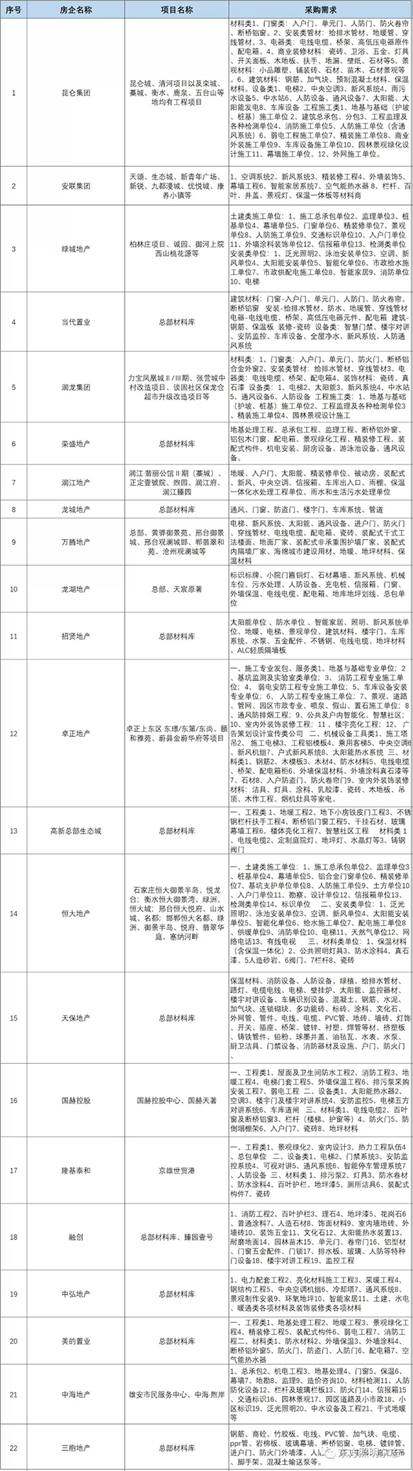 六、部分开发商采购需求