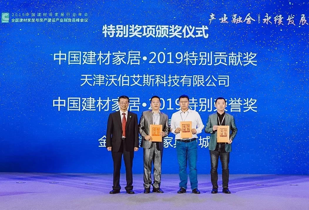 接下来,表彰了三个2019年对协会及行业发展有着特殊贡献的企业,金彩汇副会长兼秘书长张彩虹宣读了《关于授予天津沃伯艾斯科技有限公司“中国建材家居•2019特别贡献奖”的决定》、《关于授予三人禾集团“中国建材家居•2019特别荣誉奖”的决定》、《关于授予金盛达建材家具商城“中国建材家居•2019特别荣誉奖”的决定》,金彩汇会长秦占学为三个企业颁奖。