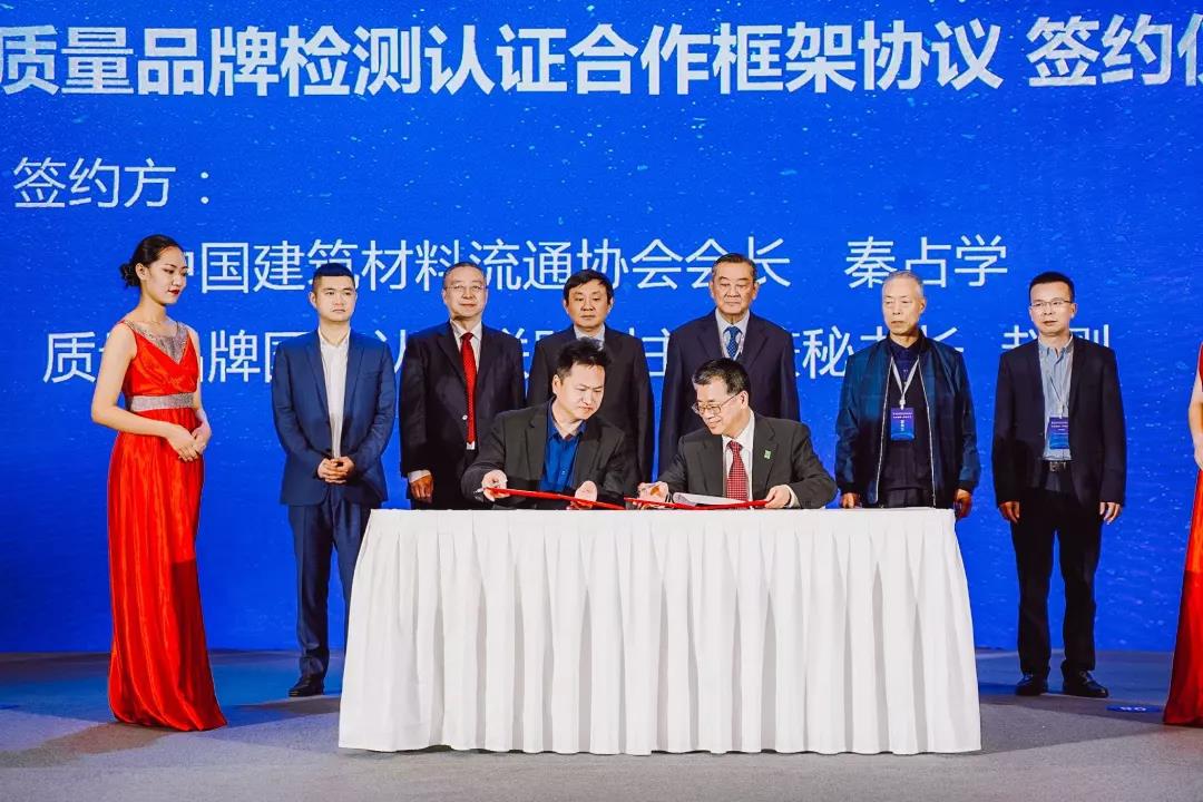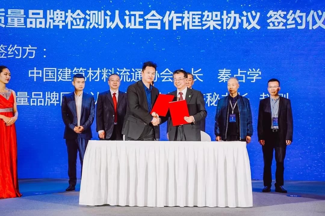 接下来,会议进行了“一次认证、全球通行”金彩汇与质量品牌国际认证联盟就《质量品牌检测认证合作框架协议》的签约仪式。邀请了国务院参事室原副主任蒋明麟,全国双打办原副主任、质量品牌国际认证联盟副主席李振中,帝海投资控股集团董事长李小明,中国县域经济报总编辑孟宪江以及东鹏控股总裁龚志云作为鉴签嘉宾。双方的合作将推动建材与家居企业和产品“走出去”,为企业开拓国际市场提供便利条件,助力建材家居行业高质量发展。