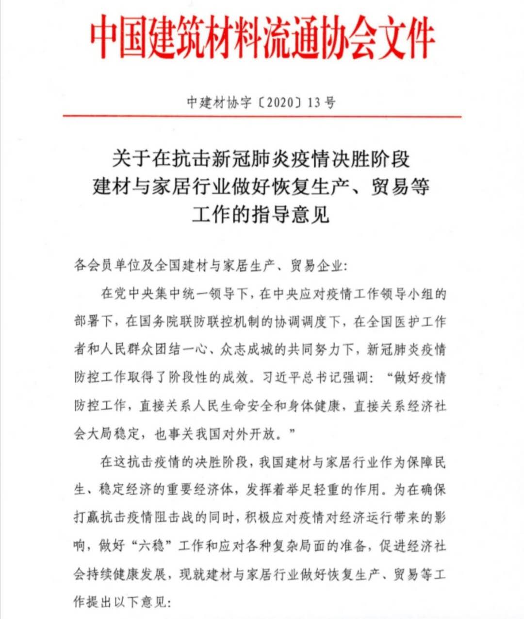 为确保打赢新冠肺炎疫情防控阻击战的同时,积极应对疫情对经济运行带来的影响,做好“六稳”工作和应对各种复杂局面的准备,促进经济社会持续健康发展,金彩汇日前印发了《关于在抗击新冠肺炎疫情决胜阶段建材与家居行业做好恢复生产、贸易等工作的指导意见》(中建材协字〔2020〕13号)。现将文件转发你们,请各会员单位、行业企业积极贯彻落实,遵照执行,文件具体内容详见附件。