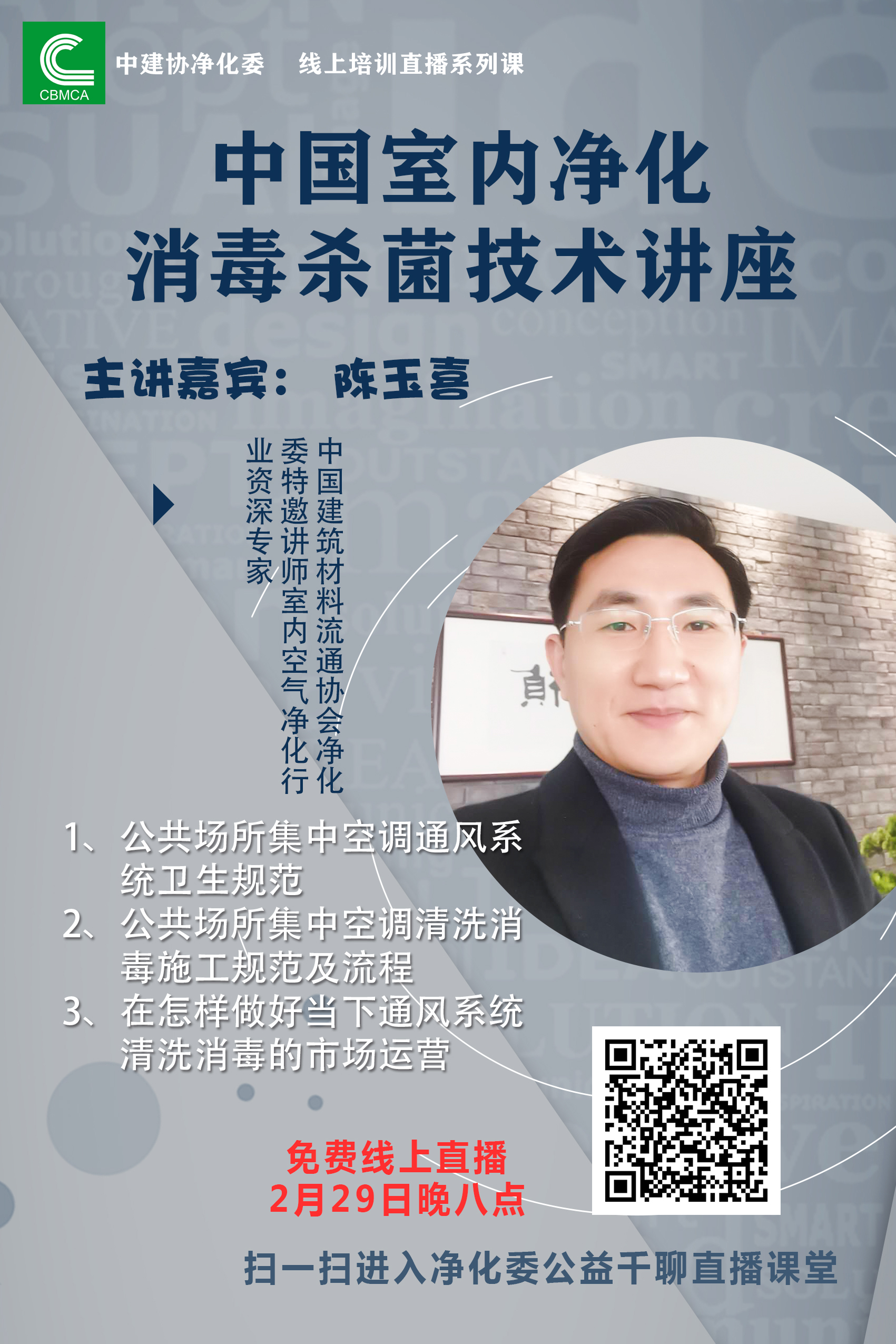 2月29日第3期技术讲座同样延续了此前两期的如潮好评,室内空气净化行业资深专家陈玉喜老师从复工后办公及公共场所空调通风系统如何安全合理使用的角度切入,带领大家一同了解集中空调的卫生知识、清洗消毒施工规范及流程,并探讨剖析怎样做好当下通风系统清洗消毒的市场运营等问题。