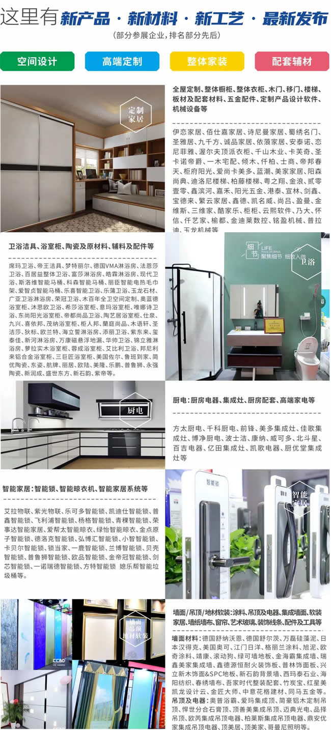 2021中国·成都建博会结合市场与行业的变化和需求,对参展产品展示进行了系统升级,强化行业热点产品展示,合理布局产业链上下游衍生产品展示。展品范围覆盖定制家居、墙面、吊顶、地材、软装、卫浴、陶瓷、厨电、智能家居、暖通舒适家居、门窗、装配式建筑、建筑新材料等行业产业链全覆盖,是中西部地区展品最全、规模最大的行业盛会,目前参展企业已超1300家,参展品牌包括: