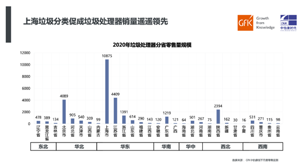 2019年7月1日,《上海生活垃圾管理条例》正式实施,其严格的分类标准和处罚措施,曾被网友评为“史上最严”垃圾分类条例。根据GfK中怡康监测数据显示,线下市场分省份来看,最早实施生活垃圾分类的上海垃圾处理器销量遥遥领先,占据全国销售的34%。