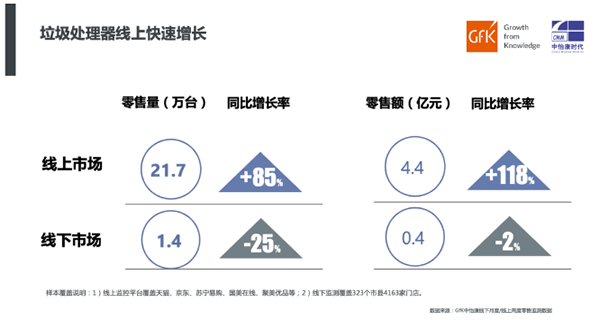 线上渠道有着不可复制的优势,对于消费者来说,只要存在网络,就可以购买自己需要的商品,并且选择商品范围相比线下要更为广泛。爆发的疫情之下,消费者强制性宅家,这一优势更为明显。根据GfK中怡康监测数据显示,2020年线上市场垃圾处理器零售量规模达到21.7万台,同比增长85%,零售额规模4.4亿元,同比增长达到了118%。