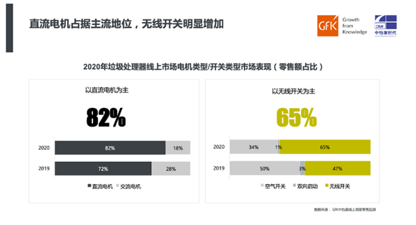 从线上市场产品主要特性来看,垃圾处理器直流电机占据市场主流,2020年零售额份额达到了82%;另外,垃圾处理器开关分为空气开关、双向启动及无线开关三种,根据GfK中怡康监测数据显示,无线开关的零售额份额已经达到65%,对比2019年提高了18个百分点。