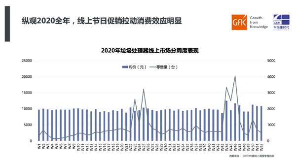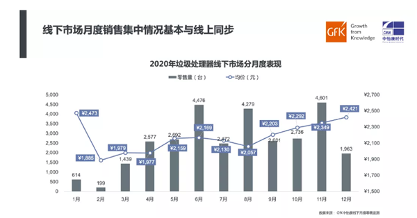 随着垃圾分类条例的逐步实施,垃圾处理器线下市场保持着稳健增长。根据GfK中怡康线下月度零售监测数据显示,2020年垃圾处理器线下市场月度销售集中情况与线上渠道基本同步。线下零售量在11月达到峰值,均价则在12月达到2421元。