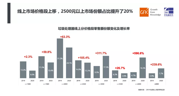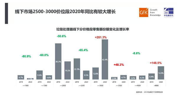 从垃圾处理器线下市场分价格段表现来看,对比2019年,2020年线下市场2500-3000元价位段零售额份额同比增长最为明显,涨幅达261.3%。4000元以上产品零售额份额也呈现快速增长趋势,同比增长148.5%。