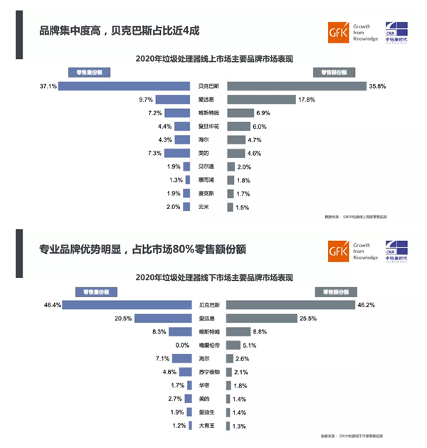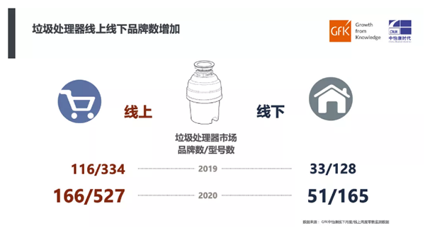 由于垃圾处理器整个行业处于起步阶段,市场井喷之际,销售品牌数量迅速扩大,根据GfK中怡康监测数据显示,2020年线上市场品牌数量多达166个,对比2019年增加了50个,线下市场品牌数量目前已超过五十家。