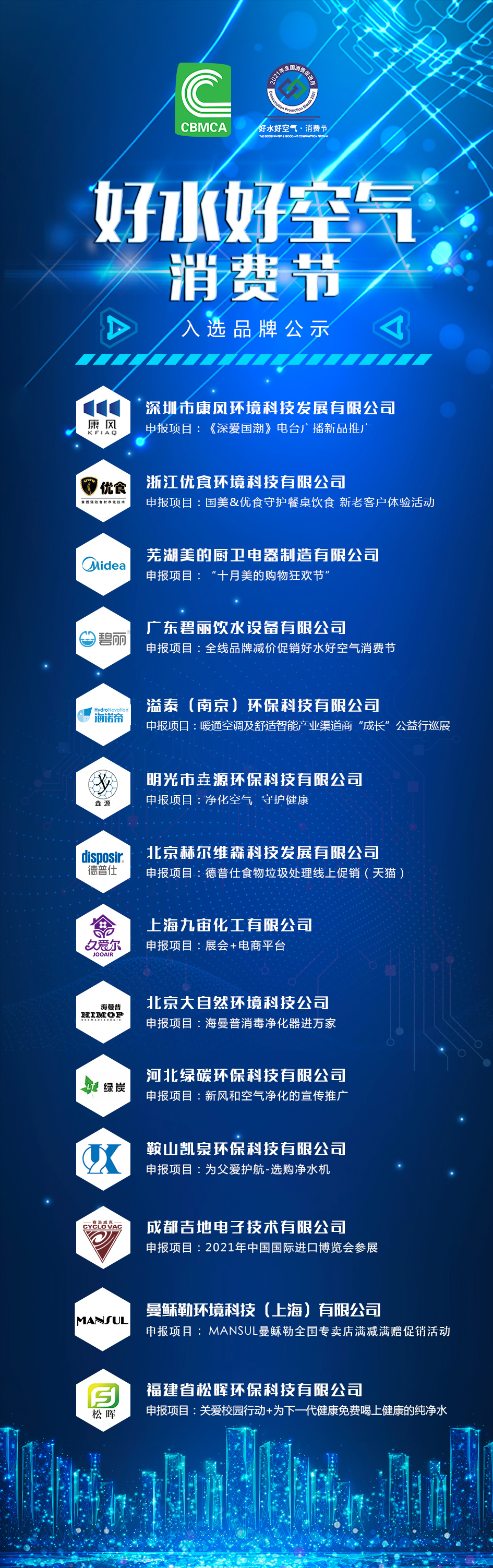 金彩汇室内净化服务委员会的“好水好空气消费节”,纳入商务部等六大部委联合推出的“全国消费促进月”系列活动总目录。 通过面向会员企业及相关单位征集“好水好空气”品牌推广活动,经过中建协净化委的严格审核,层层遴选,特将本年度“好水好空气·入选品牌”公示如下: