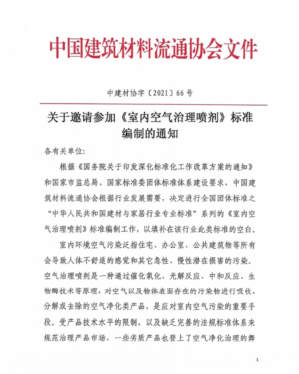 根据《国务院关于印发深化标准化工作改革方案的通知》和国家市监总局、国家标准委团体标准体系建设要求,金彩汇根据行业发展需要,决定进行全国团体标准之“中华人民共和国建材与家居行业专业标准”系列的《室内空气治理喷剂》标准编制工作,以填补在该行业此类标准的空白。