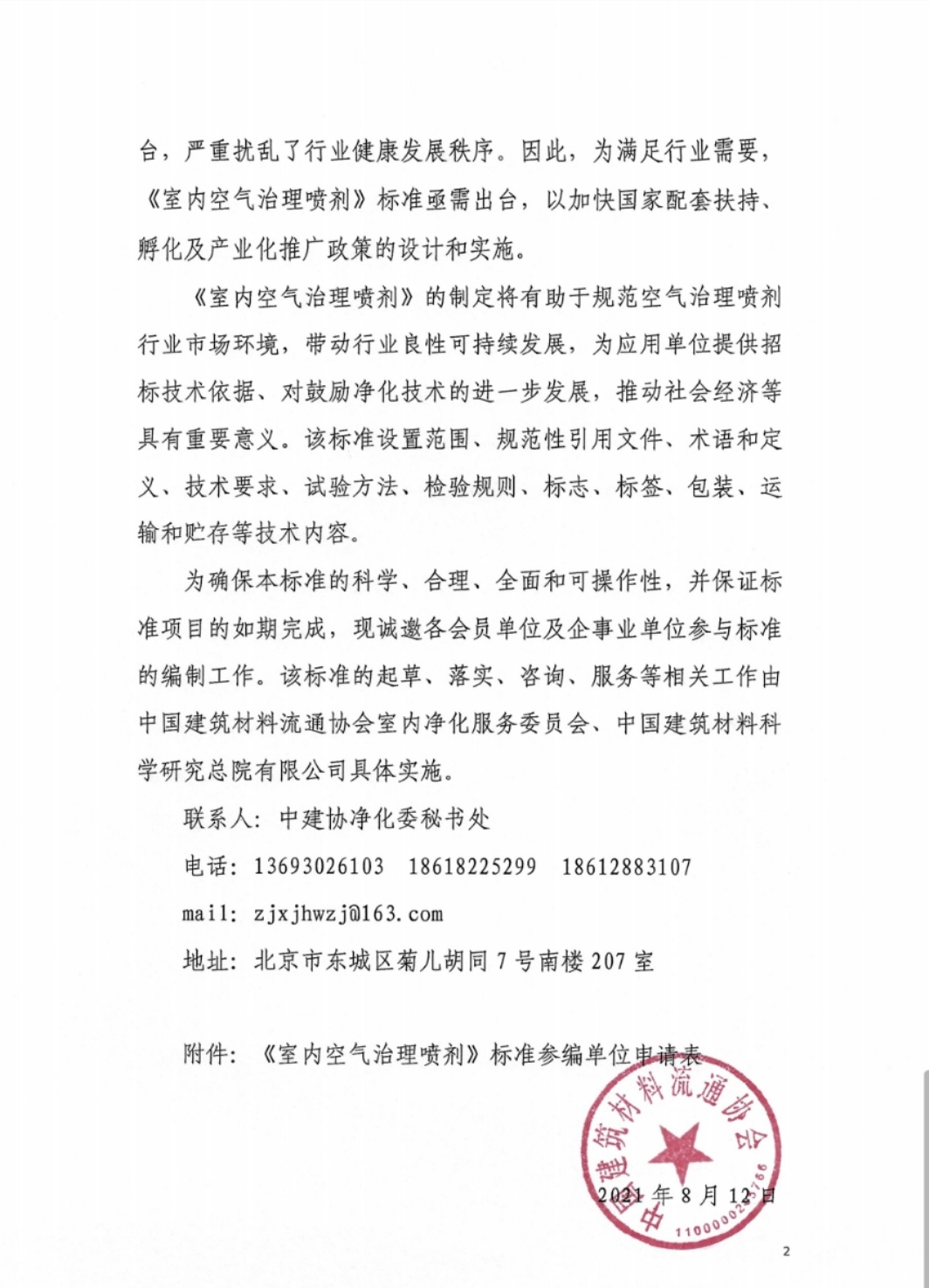 为确保本标准的科学、合理、全面和可操作性,并保证标准项目的如期完成,现诚邀各会员单位及企事业单位参与标准的编制工作,若相关单位同意派员参加该标准编制工作,请填写参编单位申请表,该标准的起草、落实、咨询、服务等相关工作由金彩汇室内净化服务委员会、中国建筑材料科学研究总院有限公司具体实施。