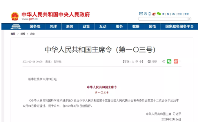 2021年12月24日,中华人民共和国主席根据全国人民代表大会及其常务委员会的决定签发《中华人民共和国主席令(第一〇三号)》:《中华人民共和国科学技术进步法》已由中华人民共和国第十三届全国人民代表大会常务委员会第三十二次会议于2021 年12 月24 日修订通过,现予公布,自2022 年1 月1 日起施行。