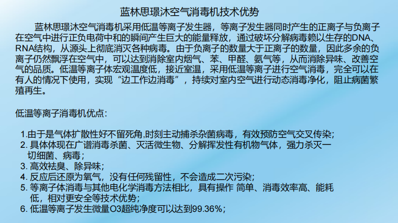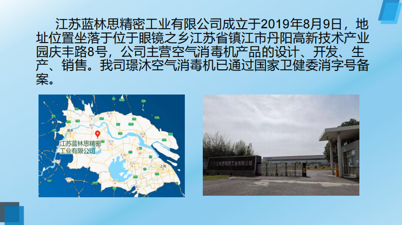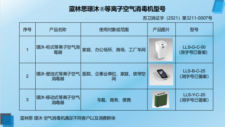 江苏蓝林思精密工业有限公司主营空气消毒机产品的设计、开发、生产、销售。璟沐空气消毒机已通过国家卫健委消字号备案。空气消毒机采用低温等离子发生器,完全可以在有人的情况下使用,实现了边工作边消毒,持续对室内空气实行动态消毒净化,阻止病菌繁殖再生。