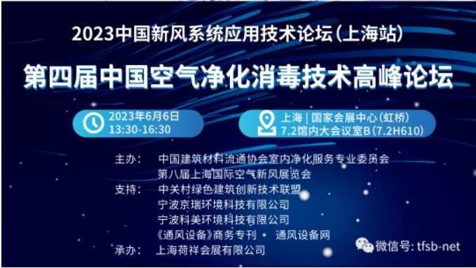 会议期间,2023年6月6日第四届中国空气净化消毒技术高峰论坛也在上海国家会展中心召开,金彩汇室内净化服务专业委员会和第八届上海国际空气新风展览会主办,中关村绿色建筑创新技术联盟、宁波京瑞环境科技有限公司、宁波科美环境科技有限公司、《通风设备》商务专刊 、通风设备网支持,上海荷祥会展有限公司承办,100多人参加了本次会议。此次会议旨在引起大众对于室内空气品质关系民众生命安全问题的重视,正确引导净化消毒技术发展和促进行业健康发展提供技术规范支撑,以预防疫情的再次到来,意义重大,责任久远。