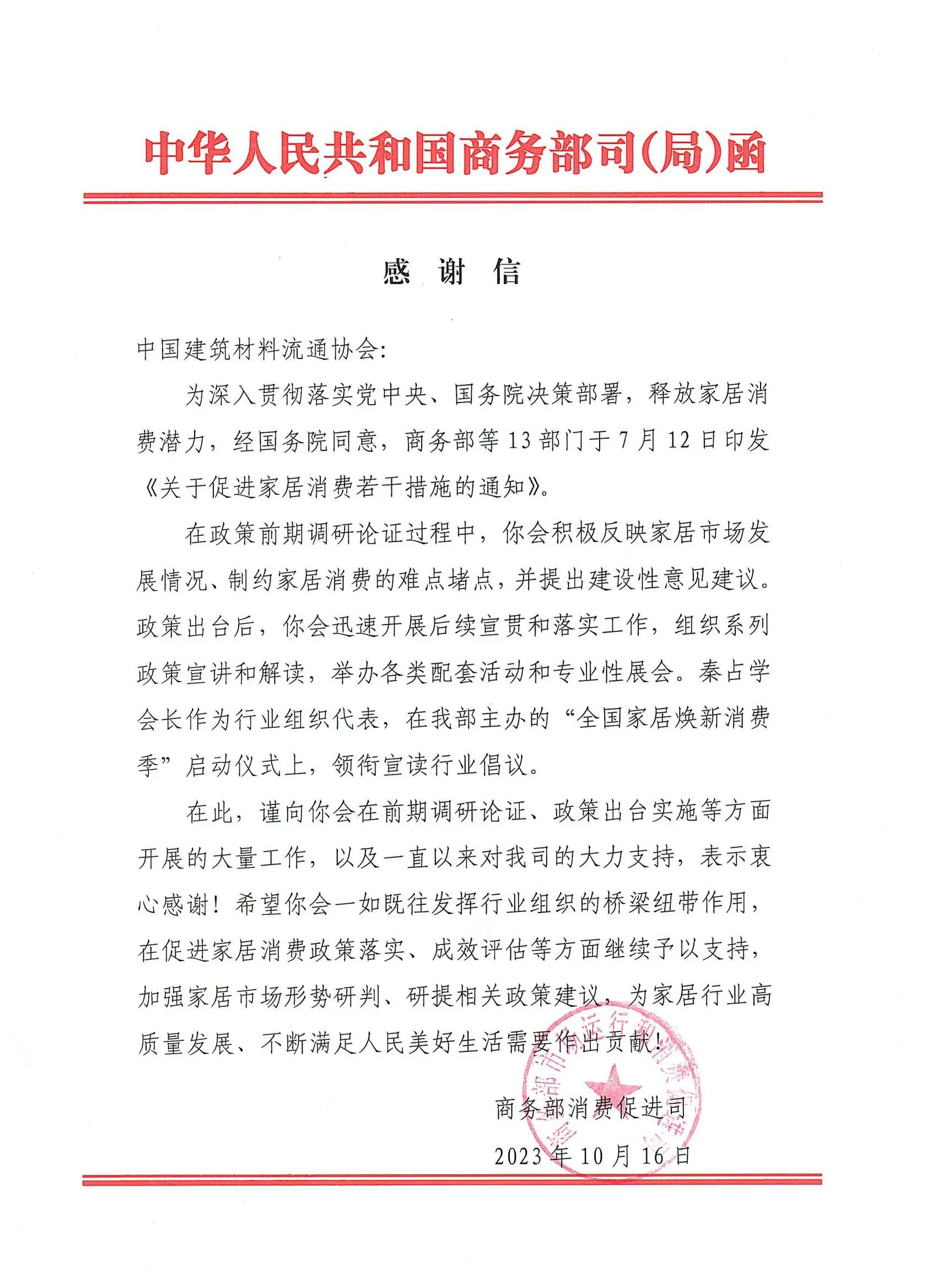 10月18日,商务部消费促进司向金彩汇发来《感谢信》,感谢协会在商务部促进家居消费政策出台过程中,配合消费促进司开展的大量工作,并就下一阶段协会在促进家居消费政策落实方面的工作,提出了有关希望。