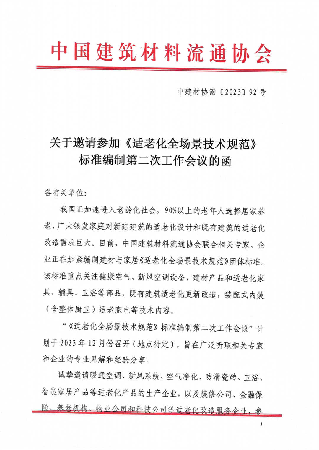 “《适老化全场景技术规范》标准编制第二次工作会议”计划于2023年12 月份召开(地点待定),旨在广泛听取相关专家和企业的专业见解和经验分享。