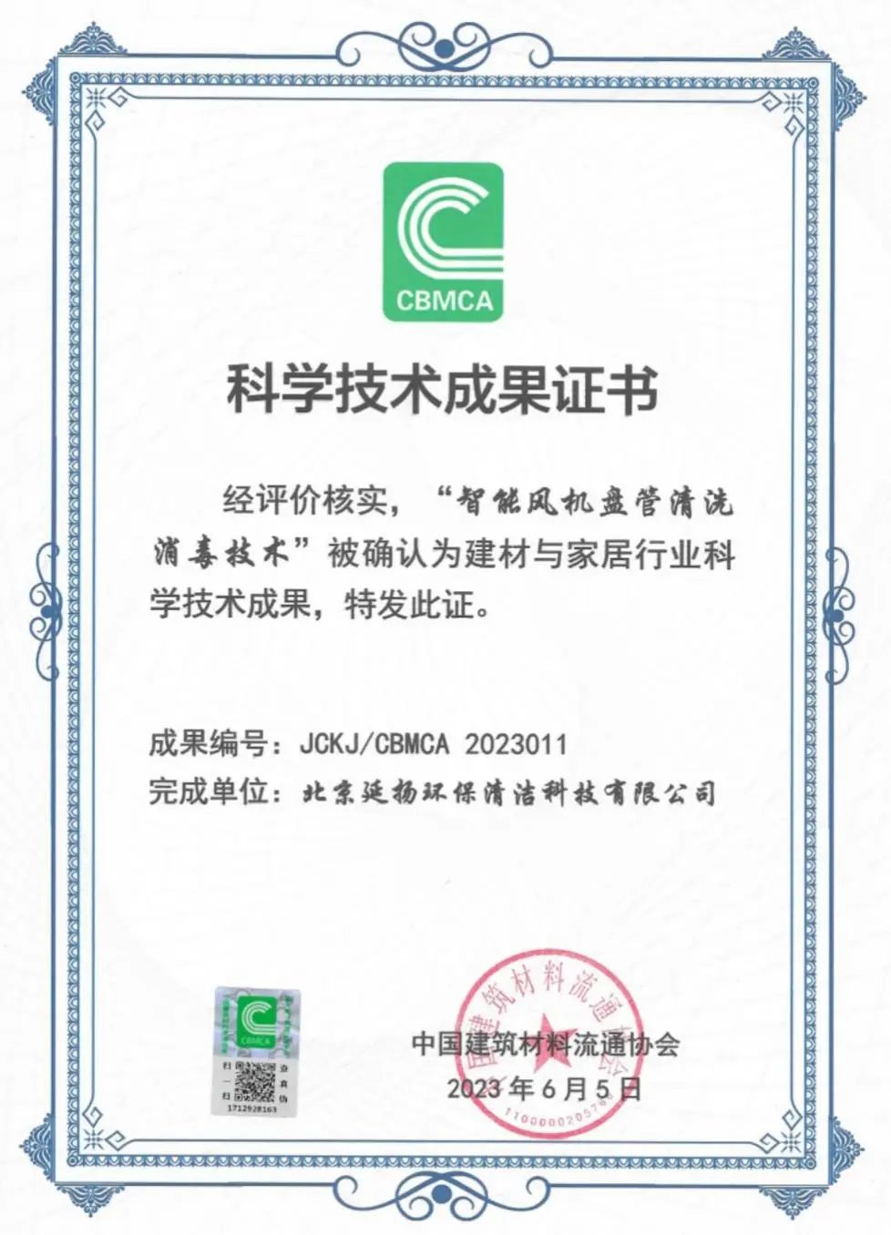2023年6月5日,北京延扬环保清洁科技有限公司的“智能风机盘管清洗消毒技术”通过了金彩汇的科技成果评价,成为建材与家居行业的一项重要科学技术成果。