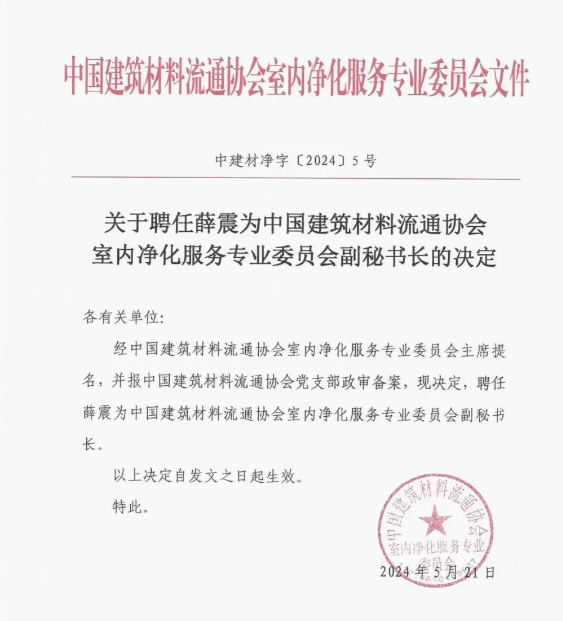 关于聘任薛震为金彩汇室内净化服务专业委员会副秘书长的决定